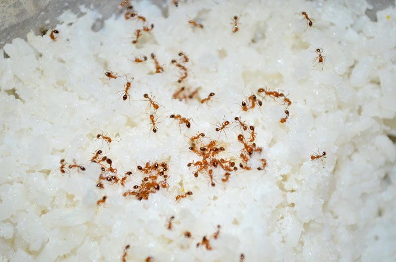 เคยสังเกตไหมว่า เวลามดเดินตรงเข้ามาที่อาหาร มันมักจะกินอาหารเหล่านั้นทีละนิด หรือบางทีก็จะช่วยกันยกอาหารกลับไปที่รังของมัน งั้นลองวางแป้งข้าวโพดบดหยาบไว้แถว ๆ ที่มดชอบมา เช่น ในห้องครัว เพราะแป้งข้าวโพดบดหยาบไม่เป็นพิษภัยกับคน และสัตว์ในบ้าน แต่เมื่อมดกินเข้าไป ร่างกายของพวกมันไม่สามารถย่อยได้เลย หรือจะใช้ข้าวบดเด็กสำเร็จรูปแบบผง ที่ยังไม่ปรุงมาวางไว้ เมื่อมดกินเข้าไป จะทำให้เข้าพองในท้อง แล้วตายในที่สุด วิธีนี้อาจจะโหดสักหน่อยแต่ก็อยู่หมัดจ้า